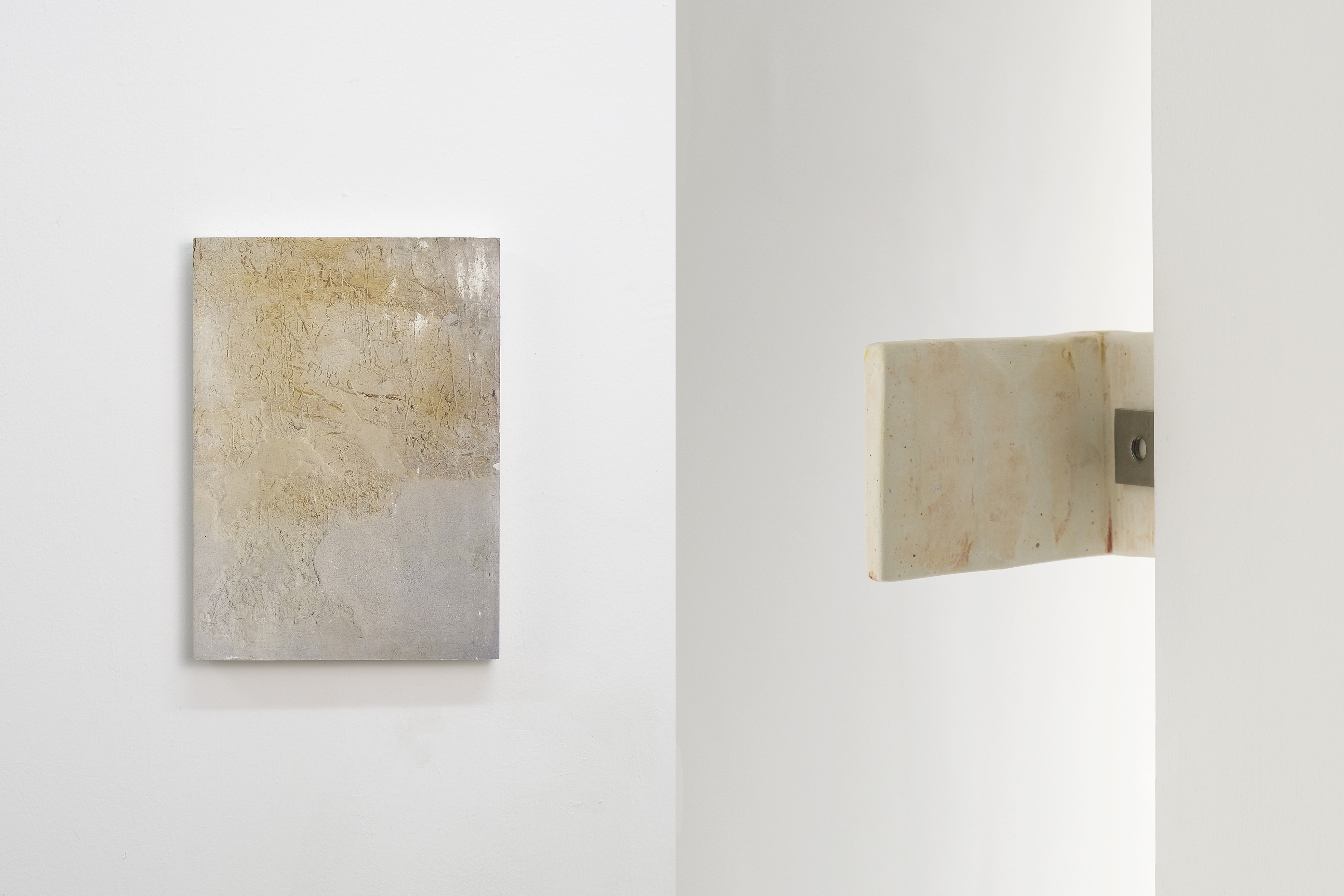 found ceramic fragments onto plaster slab, photographs transferred onto plaster slabs, archival pigment prints mounted on plywood, archival pigment prints in walnut frames, metal, plaster and ceramic fragments, inkjet print on paper. dimensions variable
